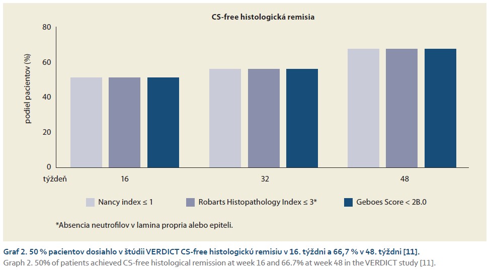 Najnovšie priebežné dáta zo štúdie, prezentované na kongrese ECCO 2025 (dáta k septembru 2024), priniesli pozoruhodné a do istej miery prekvapivé výsledky týkajúce sa dosiahnuteľnosti cieľov po 48 týždňoch liečby. Pôvodné odhady pri dizajne štúdie VERDICT predpokladali, že cieľ v najprísnejšej skupine 3 dosiahne len 30 % pacientov. Priebežné výsledky však ukazujú mieru dosiahnutia cieľa, ktorá je viac ako dvojnásobná. V populácii pacientov s kompletnými dátami po 48 týždňoch (completer analysis) dosiahlo cieľ „disease clearance“ až 67,2 % pacientov. V konzervatívnejšej analýze všetkých randomizovaných pacientov (intention-to-treat) dosiahlo tento cieľ 46,4 % pacientov [10]. Tieto čísla jasne demonštrujú, že s cielenou a proaktívne eskalovanou liečbou, ako je vedolizumab v rámci T2T stratégie, je aj ten najprísnejší kompozitný cieľ reálne dosiahnuteľný u veľkej časti pacientov so stredne ťažkou až ťažkou UC. Dáta zo štúdie VERDICT silne podčiarkujú koncept „okna príležitosti“ v liečbe UC. Výsledky konzistentne ukazujú, že biologicky naivní pacienti majú podstatne vyššiu šancu na dosiahnutie terapeutických cieľov. V skupine 3 („disease clearance“) dosiahlo po 48 týždňoch cieľ 70,1 % bionaivných pacientov, zatiaľ čo u bioexponovaných pacientov to bolo 50,0 % (graf 1) [10].Tento významný rozdiel naznačuje, že dlhšia história zápalu a predchádzajúce zlyhanie liečby znižujú strop dosiahnuteľných výsledkov. Včasné nasadenie vysoko účinnej liečby u pacientov s rizikovými faktormi je preto kľúčové pre maximalizáciu šance na dosiahnutie najhlbšej možnej remisie. Detailná analýza histologických nálezov v skupine tri štúdie VERDICT ukazuje, že histologické hojenie je postupný proces. Dáta preukázali inkrementálne zlepšovanie vo všetkých hodnotených histologických indexoch (Nancy, RHI, Geboes) v časových bodoch 16, 32 a 48 týždňov. Napríklad, priemerná zmena RHI od východiskovej hodnoty sa zlepšila z –9,0 v týždni 16 na –12,2 v týždni 48. Hodnotenia histologickej remisie boli podobné pre skóre NI, RHI aj Geboes (definované ako skóre < 2B.0), pričom 50 % pacientov dosiahlo CS-free histologickú remisiu v 16. týždni a 66,7 % v 48. týždni (graf 2) [11]. Tieto zistenia naznačujú, že liečba vedolizumabom vedie k postupnému a trvalému potláčaniu mikroskopického zápalu, čo si vyžaduje dostatočný čas na dosiahnutie maximálneho účinku.