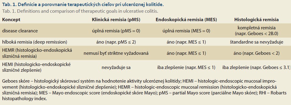 Je nevyhnutné presne odlíšiť „disease clearance“ od iných, často používaných, no menej prísnych konceptov hlbokej remisie, aby sa predišlo terminologickým nejasnostiam. Deep remission (hlboká remisia): tento termín sa najčastejšie vzťahuje na kombináciu klinickej a endoskopickej remisie (napr. pMS ≤ 2 a MES ≤ 1). Kľúčovým rozdielom je, že štandardne nezahŕňa požiadavku na histologickú remisiu. HEMR (Histologic-endoscopic mucosal remission): tento kompozitný ukazovateľ kombinuje endoskopickú a histologickú remisiu (napr. MES ≤ 1 a Geboes skóre < 2). Hoci zahŕňa histológiu, nemusí nevyhnutne vyžadovať striktnú klinickú remisiu (pMS = 0) alebo úplne normálny endoskopický nález (MES = 0). HEMI (Histologic-endoscopic mucosal improvement): predstavuje ešte menej prísny cieľ, ktorý vyžaduje len zlepšenie, nie úplnú remisiu na oboch úrovniach (napr. MES ≤ 1 a Geboes skóre ≤ 3.1) (tab. 1).