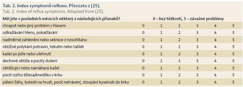 Užitečný při odběru anamnézy může být dotazník Indexu symptomů refluxu podle Belafskyho. Pokud je součet bodového ohodnocení jednotlivých položek vyšší než 13, je vysoká pravděpodobnost přítomnosti patologického EER (tab. 2) [25].