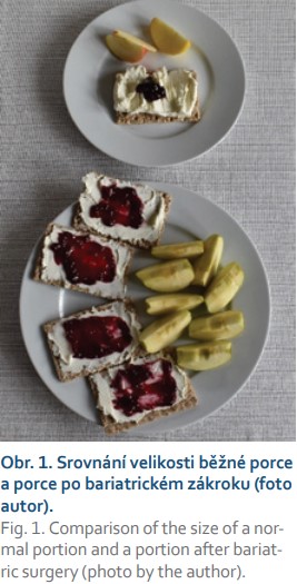 Energetický příjem po restriktivních operacích v dlouhodobém režimu musí být nastaven s ohledem na individuální charakteristiky jedince, přičemž je třeba zohlednit především věk, tělesnou hmotnost a výši fyzické aktivity. V prvním roce po zákroku se obvykle energetický příjem pohybuje mezi 700 a 900 kcal/den (2 960–3 800 kJ), v pozdějším období stoupá na 1 000–1 400 kcal (4 200–5 880 kJ). Velikost porce po bariatrickém zákroku je v porovnání s běžnou porcí přibližně třetinová (obr. 1) [4].