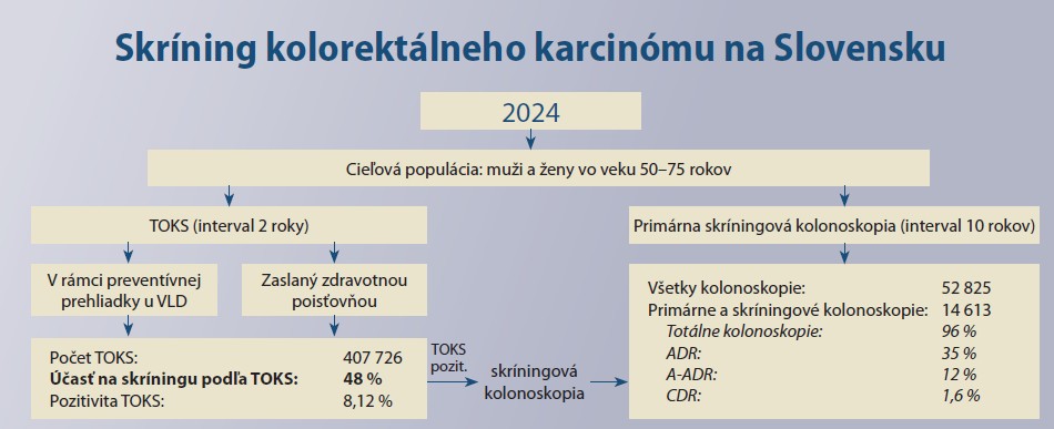 Skríning kolorektálneho karcinómu na Slovensku je v súčasnosti určený pre populáciu vo veku 50–75 rokov, bez známych rizikových faktorov ochorenia v anamnéze. Skríningovým testom je TOKS – FIT, v intervale 1-krát za dva roky alebo tzv. primárna skríningová kolonoskopia (bez predchádzajúceho FIT) raz za 10 rokov. FIT je spravidla realizovaný v rámci pravidelnej preventívnej prehliadky na ambulancii všeobecného lekára pre dospelých, a to buď metódou point of care testing (POCT) alebo je vzorka odoslaná do biochemického laboratória. Aktuálne nie je definovaný jednotný cut-off pre pozitivitu FIT. Osoby z cieľovej populácie, ktoré sa na skríningu KRCA nezúčastňujú, t. j. nemali v predchádzajúcich dvoch rokoch vykonaný TOKS a súčasne nemali vykonanú v posledných 10 rokoch kolonoskopiu, sú na skríning aktívne pozývané. Pozvánku zasielajú zdravotné poisťovne a súčasťou pozvánky je aj kvalitatívny FIT s inštrukciami k jeho vykonaniu a následnému odovzdaniu na ambulancii príslušného praktického lekára k vyhodnoteniu.