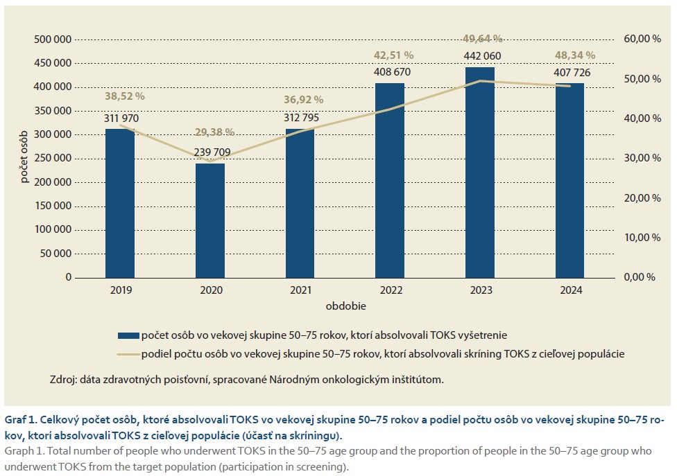Od zavedenia aktívneho pozývania na skríning KRCA v SR sme až do minulého roka pozorovali každoročný nárast počtu vykonaných skríningových TOKS a z toho odvodenú zvyšujúcu sa účasť cieľovej populácie na skríningu (graf 1). Táto v roku 2023 dosiahla takmer 50 %. Účasť na skríningu je dlhodobo vyššia u žien než u mužov, a to o cca 6–7 % (52 vs. 45–46 % v rokoch 2023 a 2024). Je možné, že okrem aktívneho pozývania, sa na výraznom vzostupe počtov vykonaných vyšetrení v rokoch 2022 a 2023 podieľal aj akýsi rebound fenomén po útlme skríningových vyšetrení v pandemických rokoch 2020 a 2021, čo by zároveň mohlo vysvetľovať mierny pokles účasti v roku 2024. Súčasne sme zaznamenali aj postupný pokles počtu osôb pozvaných na skríning (zo 401 901 v 2022 na 283 262 v 2024) [12].