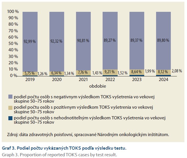 Od roku 2019 sme pozorovali každoročný nárast pozitivity vykonaných TOKS, s maximom 9,2 % v roku 2022, s následným postupným poklesom na 8,1 % pozitívnych TOKS v roku 2024 (graf 3). U mužov je podiel pozitívnych TOKS očakávane dlhodobo vyšší než u žien, a to o približne o 4 % (pozitivita 10,2 % u mužov vs. 6,4 % u žien v roku 2024) [12].