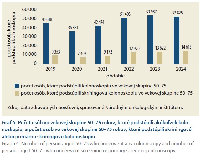 Počet kolonoskopií v cieľovej skupine osôb (graf 4) sleduje trend vývoja počtu osôb, ktoré podstúpili TOKS (graf 1). Do sledovania sú zahrnuté všetky kolonoskopie vykonané za daný rok vo vekovej skupine 50–75 rokov, z nich sú osobitne sledované kolonoskopie vykázané skríningovými kódmi. V priebehu rokov pozorujeme kontinuálny nárast počtu skríningových kolonoskopií. Približne 53 % zo všetkých skríningových kolonoskopií bolo vykonaných u mužov, čo je logickým dôsledkom vyššieho podielu pozitívnych TOKS u mužov v porovnaní so ženami. V podskupine primárnych skríningových kolonoskopií je pomer mužov a žien posledné dva roky vyrovnaný, pričom v minulosti tento typ kolonoskopie častejšie podstupovali ženy [12].