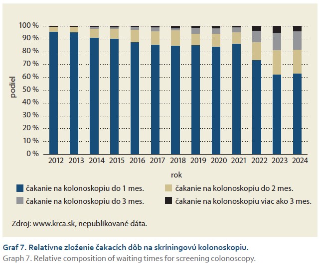 V registri skríningových kolonoskopií sme za rok 2024 zaznamenali 12 402 odoslaných validných formulárov, vývoj počtu formulárov sleduje graf 5. V rámci skríningu dlhodobo pozorujeme prevahu skríningových kolonoskopií, ktoré nasledovali po pozitívnom TOKS, nad primárnymi skríningovými kolonoskopiami (graf 6). So zvyšujúcim sa počtom vykonaných kolonoskopií v priebehu rokov pozorujeme aj predĺženie čakacích dôb na skríningovú kolonoskopiu (graf 7). Napriek tomu, podľa údajov z registra bolo > 60 % skríningových kolonoskopií vykonaných do 1 mesiaca od objednania a absolútna väčšina z nich do 3 mesiacov. Tieto údaje sú však v rozpore s vyššie komentovanými údajmi NCZI, ktoré síce uvádzajú interval od vykázania TOKS do vykázania kolonoskopie (tab. 1), ale keďže predpokladáme, že hlavným dôvodom časového odstupu medzi TOKS a kolonoskopiou je čakanie na kolonoskopiu od jej objednania, mali by tieto údaje aspoň čiastočne korelovať.