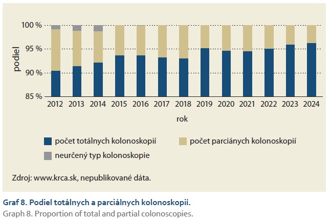 Podiel totálnych kolonoskopií bol v roku 2024 > 95 % zo všetkých skríningových kolonoskopií. V priebehu rokov zaznamenávame zlepšovanie tohto dôležitého indikátora kvality kolonoskopie (graf 8).