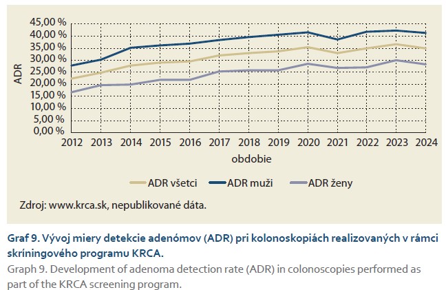 Významným indikátorom kvality skríningovej kolonoskopie je miera detekcie adenómov (ADR), ktorá má na Slovensku stúpajúci trend a v roku 2024 bola na úrovni cca 35 % (41 % u mužov a 28 % u žien) (graf 9). Sledujeme tiež mieru detekcie pokročilých adenómov (A-ADR), ktorá sa dlhodobo pohybuje v intervale 11–14 %, opäť s prevahou mužov nad ženami (14,3 vs. 9,5 % v roku 2024) (graf 10). Pokročilý adenóm je definovaný ako adenóm s veľkosťou ≥ 10 mm alebo s prítomnosťou HGIEN. V kontraste so stúpajúcim ADR, miera detekcie karcinómov (CDR) postupne klesá. Za rok 2024 dosiahla doteraz najnižšie hodnoty v sledovanom období a to 1,6 %. Ako vidno aj na grafe 11, tento pokles je výraznejší u mužov, pričom v roku 2024 sa rozdiel v CDR medzi pohlaviami takmer stráca.