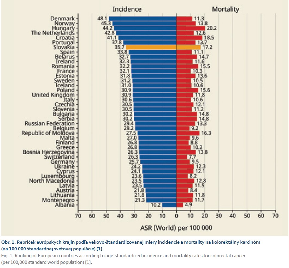 Slovenská republika sa v rámci európskych krajín dlhodobo nachádzala na niektorej z prvých troch priečok v incidencii a mortalite na KRCA. Podľa posledných údajov z GLOBOCAN z roku 2022 sa v incidencii síce posunula na 7. priečku, ale v mortalite jej stále patrí 3. priečka (obr. 1). Na porovnanie Česká republika, ktorá sa v minulosti nachádzala spolu so Slovenskom na popredných priečkach štatistík kolorektálneho karcinómu, je aktuálne na 19. mieste v incidencii a 18. v mortalite, čím sa zaraďuje na úroveň európskeho priemeru [1]. Zásadný význam pri zlepšovaní epidemiologických ukazovateľov KRCA v ČR má Národní program screeningu kolorektálního karcinomu. Od zahájenia programu v roku 2000 do roku 2022 došlo v Čechách k poklesu incidencie karcinómu hrubého čreva a konečníka o 32,3 % a mortality o 47,8 % [2].