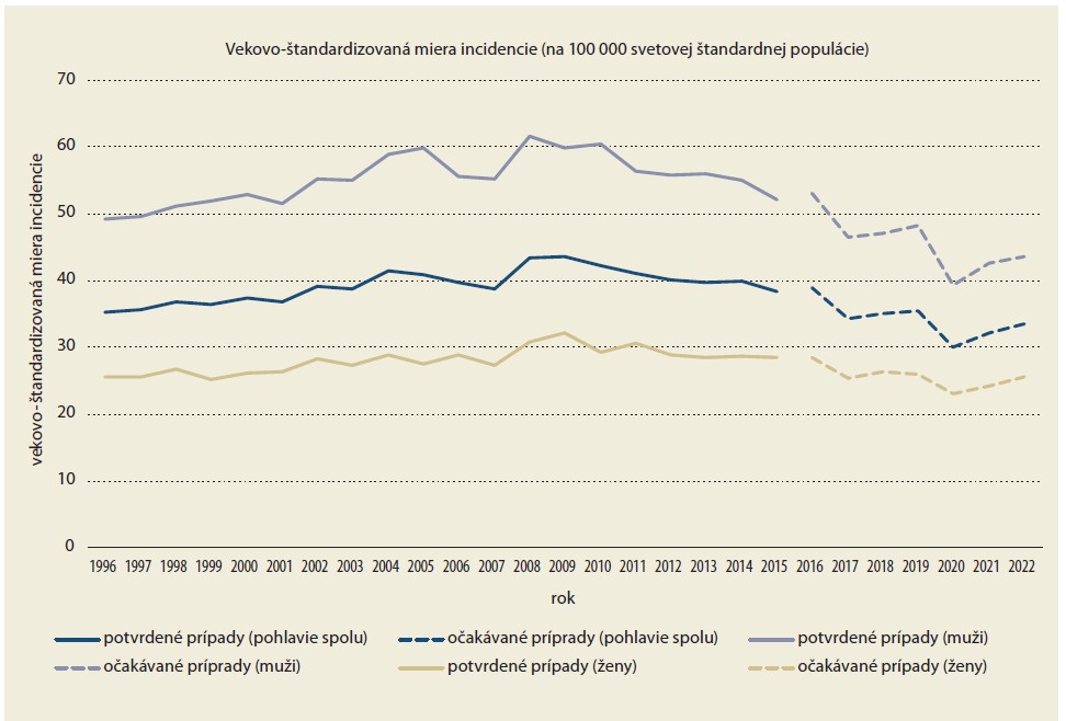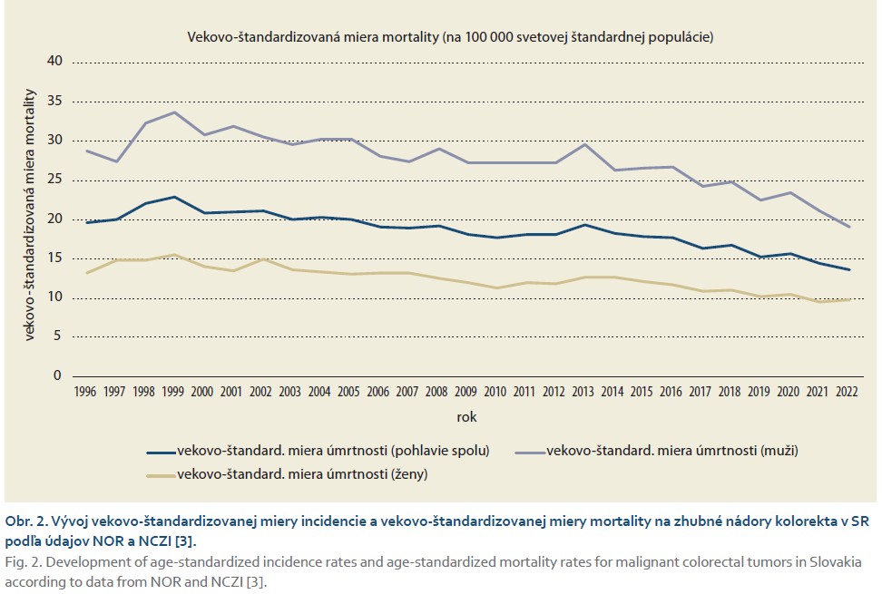 Pozvoľný pokles incidencie i mortality na KRCA v SR je zrejmý aj z dát publikovaných Národným centrom zdravotníckych informácií (NCZI) (obr. 2). Údaje o incidencii KRCA na Slovensku sa do roku 2015 (vrátane) zakladajú na potvrdených prípadoch ochorenia z dát Národného onkologického registra SR (NOR). Údaje o incidencii od roku 2016 sú tzv. očakávané prípady, na základe údajov zdravotných poisťovní o vykázanej zdravotnej starostlivosti a údajov o úmrtiach. V roku 2022 sa podľa týchto zdrojov nachádzal kolorektálny karcinóm na druhom mieste v incidencii zhubných nádorov na Slovensku, za nádormi prostaty u mužov a nádormi prsníka u žien. V mortalite sú malignity kolorekta u oboch pohlaví na treťom mieste za nádormi prsníka a pľúc u žien a za nádormi pľúc a prostaty u mužov. Spomínaný pokles mortality je výraznejší u mužov, napriek tomu je stále takmer dvojnásobná oproti ženám [3].