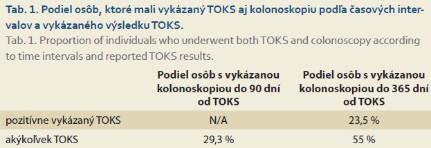 V snahe aspoň čiastočne objektívne posúdiť adherenciu ku kolonoskopii po pozitívnom TOKS a tiež intervaly medzi TOKS a následnou kolonoskopiou (čakacie doby na kolonoskopiu), sleduje NCZI časové súvislosti medzi vykázaním kódu pre TOKS a kódu pre kolonoskopiu. Ako vyplýva z tab. 1, len necelých 24 % osôb s pozitívne vykázaným TOKS malo do 365 dní vykázaný kód pre kolonoskopiu – čo môže naznačovať nízku adherenciu populácie k následnej kolonoskopii po pozitívnom TOKS. Naproti tomu v skupine všetkých osôb, ktoré mali vykázaný TOKS bez ohľadu na výsledok (t. j. zahŕňajúc i osoby s negatívne vykázaným výsledkom TOKS), malo vykázanú kolonoskopiu do 365 dní 55 % týchto osôb a do 90 dní to bolo 29 % osôb [12]. Vysoké % vykázaných kolonoskopií u osôb s vykázaným TOKS (bez ohľadu na jeho výsledok) naznačuje pravdepodobne nesprávne vykazovanie TOKS na ambulanciách všeobecných lekárov (vykazovanie pozitívneho alebo negatívneho testu bez ohľadu na jeho skutočný výsledok) a zároveň naznačuje, že len približne polovica osôb, ktoré sú ochotné podstúpiť kolonoskopiu po TOKS, ju absolvuje v intervale do 3 mesiacov.