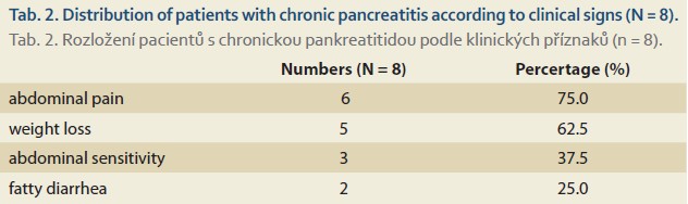 With regard to chronic pancreatitis, abdominal pain (epigastric in nature) was also the most frequent reason for consultation, occurring in 6 patients (75%), followed by fatty diarrhea in 25% of cases. General condition was altered (weight loss and anorexia) in 62.5% of cases (N = 5), and physical examination was essentially poor (Tab. 2). Biologically, macrocytosis and cholestasis syndrome associated with a cytolysis syndrome were noted in 25% each. Fecal elastase was not measured in any of the study patients, and fasting blood glucose levels were normal in all cases. Abdominal CT scans were carried out in 25% of CP cases, revealing calcification and pseudocysts. In 62.5% of cases, the etiology of CP was not determined (Graph 2).